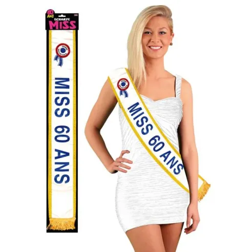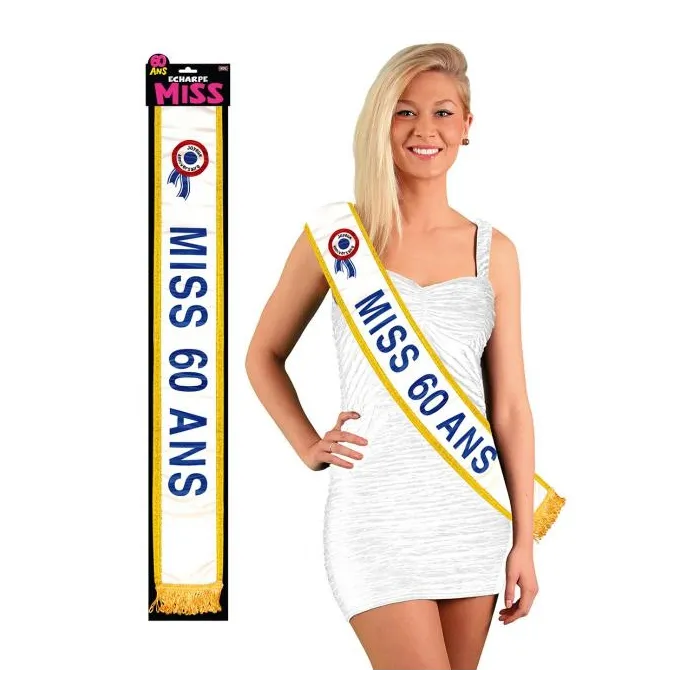Une proche entame une nouvelle décennie ? Faite d'elle la reine de la soirée en lui offrant cette superbe écharpe "Miss 60 ans". Satinée aux bordures dorées, écriture bleu pailletée, franges dorées et cocarde tricolore, cette écharpe s'apparente à celle de Miss France. Une fois placée sur l'épaule et en diagonale sur la poitrine, elle fera à coup sûr son effet !
