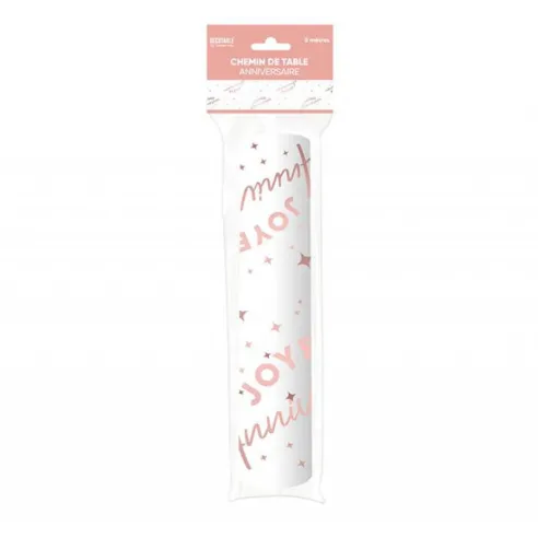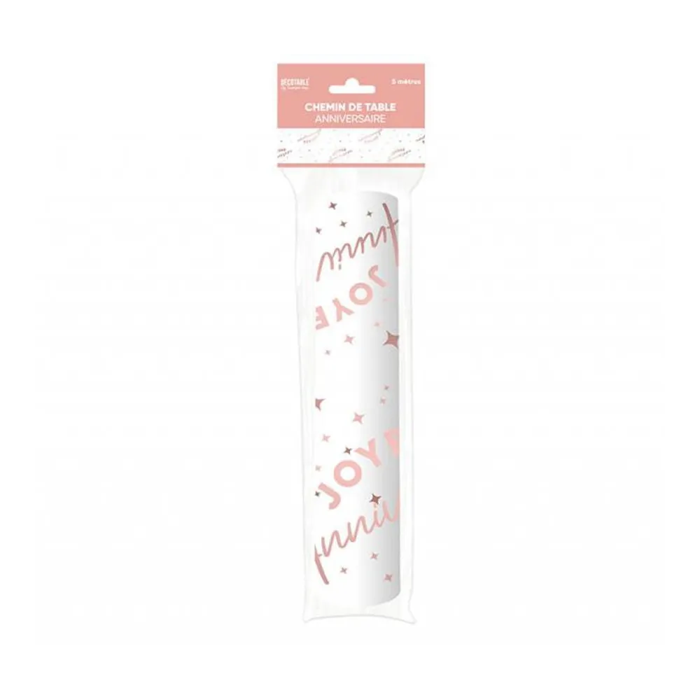 Chemin de table Joyeux Anniversaire blanc avec texte couleur métallisé avec petites étoiles. D'une longueur de 5 mètres il couvrira vos tables pour lui donner un air de fête.