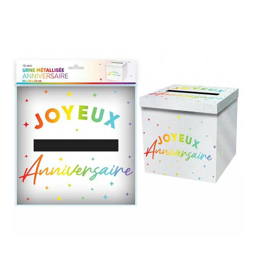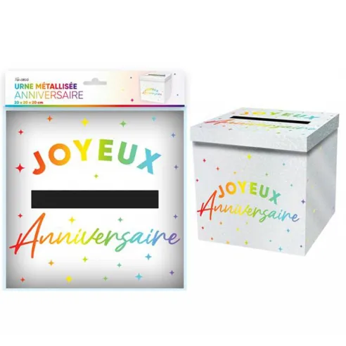 Urne décorative Joyeux Anniversaire couleur en carton rigide à poser sur une table, cette urne est l’accessoire déco indispensable pour collecter enveloppes, cartes de vœux, messages et petits cadeaux de vos invité. Urne livrée pliée.