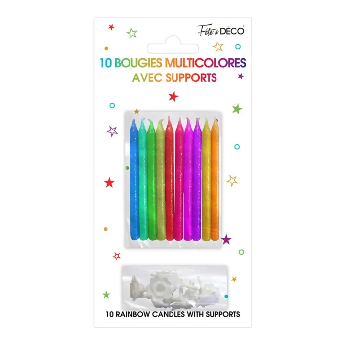 Envie d'apporter une touche de couleur à votre gâteau ? Optez pour ce lot de 10 bougies couleur pailletées et leurs supports. Disposez les sur votre gâteau à votre guise et selon le nombre d'années à souffler.