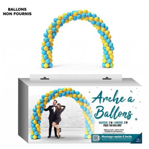 Montez très facilement cette arche à ballons décoratives avec 1 arceau à assembler, 2 tubes en métal et 2 en plastique, 35 bagues à ballons pouvant contenir 4 ballons chacune, 2 socles avec 2 sacs de lestage.