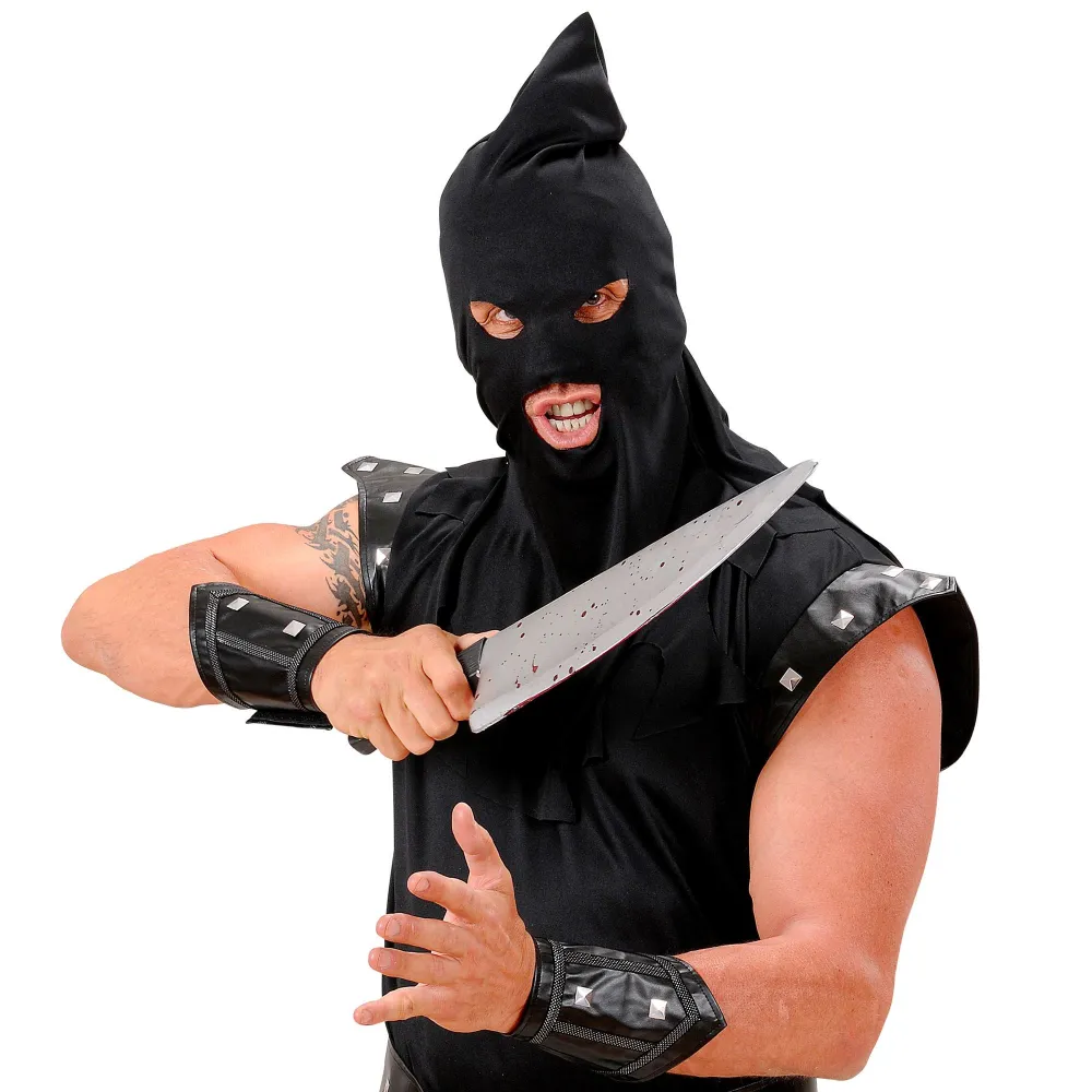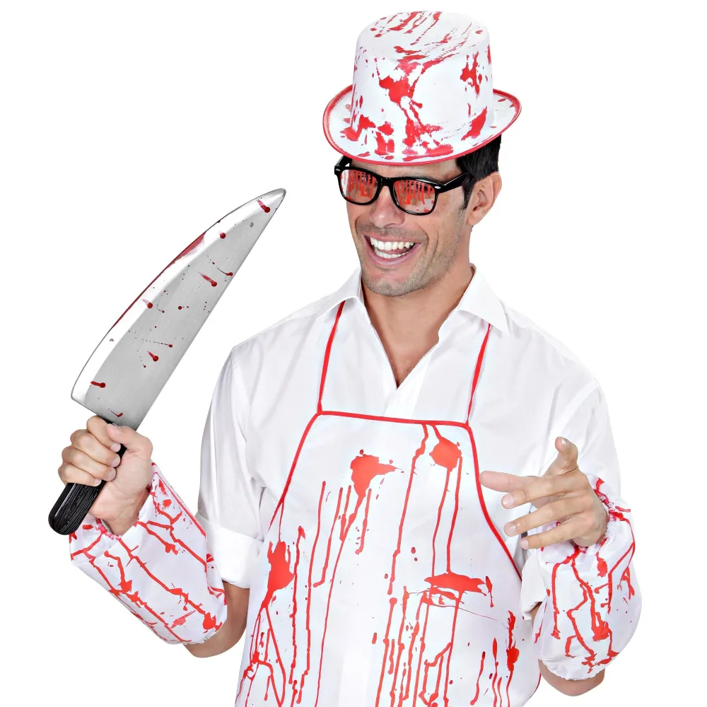 Grand couteau factice avec manche noir et lame grise ensanglanté, l'arme idéale pour compléter un déguisement de clown tueur à Halloween.