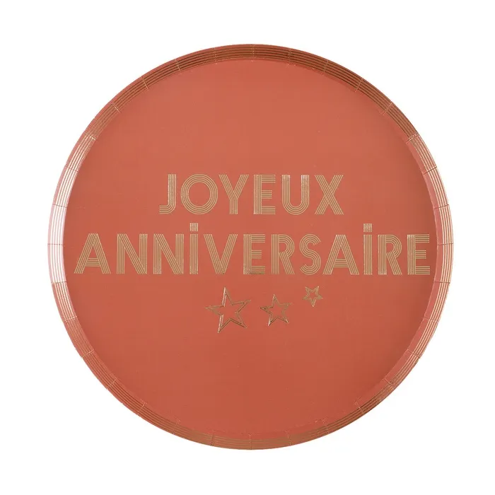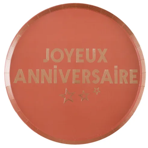 Assiettes Joyeux AnniversaireMatière: Carton Dimensions: ø 23cm Quantité: 8