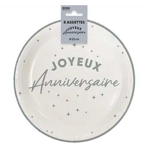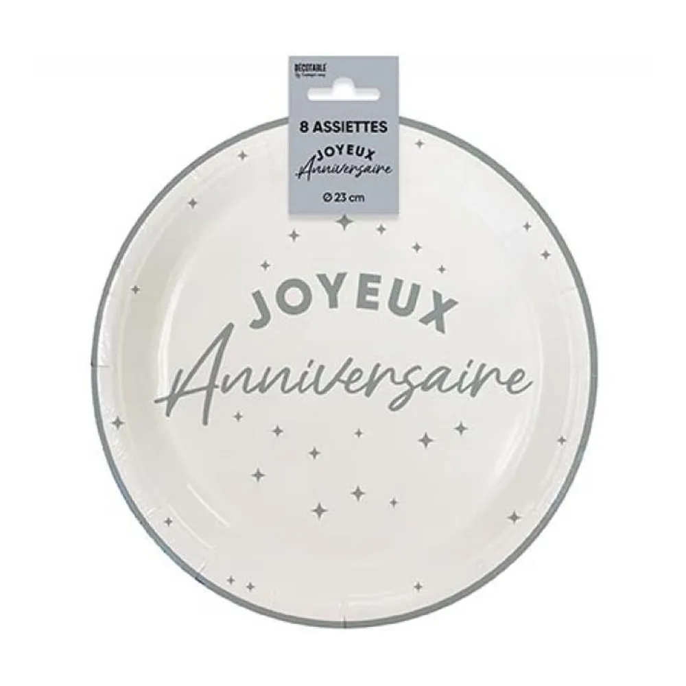 Décorez votre table d’anniversaire avec ces 8 assiettes Joyeux Anniversaire couleur en carton, d'un diamètre de 23cm. Légères et résistantes, elles sont idéales pour servir un goûter anniversaire enfant ou un buffet pour adultes.