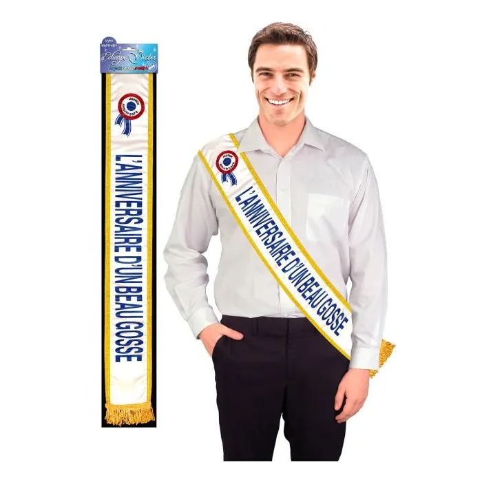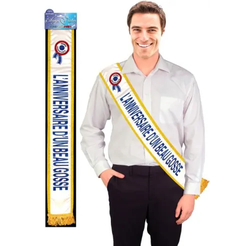 Un proche fête son anniversaire? Faite de lui le roi de la soirée et flatter son égo en lui offrant cette superbe écharpe "l'anniversaire d'un beau gosse" . Satinée aux bordures dorées, écriture bleu pailletée, franges dorées et cocarde tricolore, cette écharpe s'apparente aux écharpes officielles . Une fois placée sur l'épaule et en diagonale sur le torse, elle fera à coup sûr son effet !