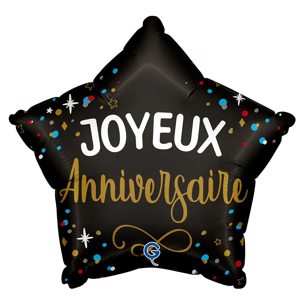 Ballon anniversaire aluminium en forme d'étoile, imprimé Joyeux Anniversaire de couleur noir pour décoration de maison ou salle.