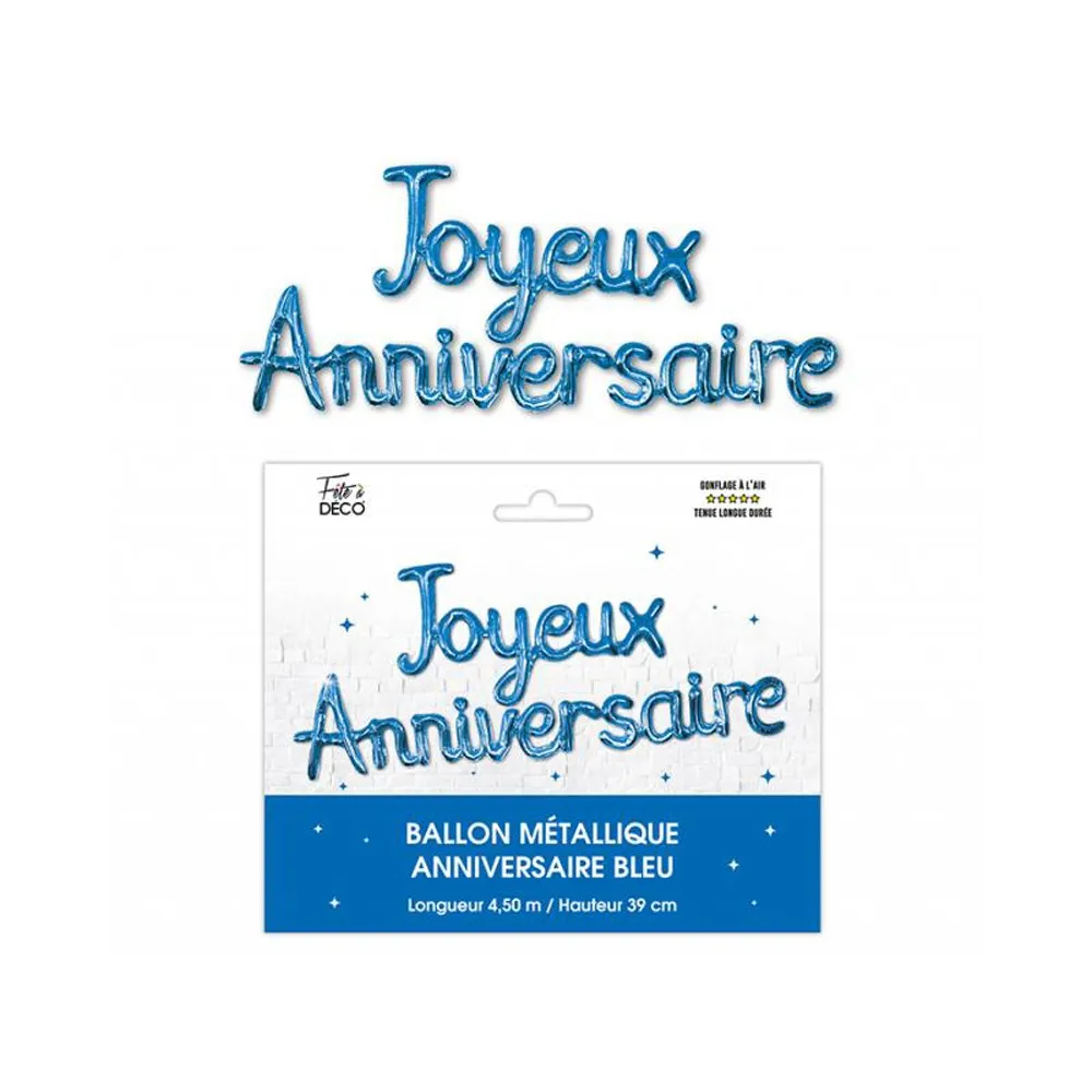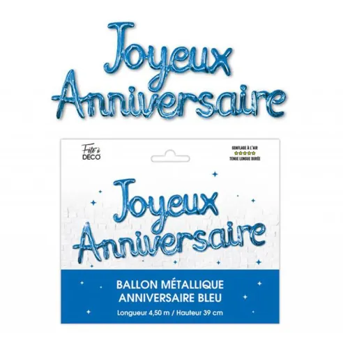 Ballons métalliques couleur qui forment le mot Joyeux Anniversaire. A accrocher en suspension ou fixé sur un mur avec un adhésif double face.