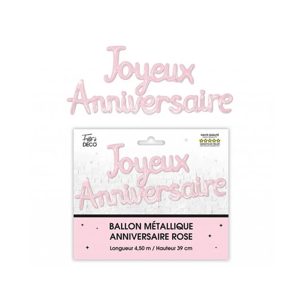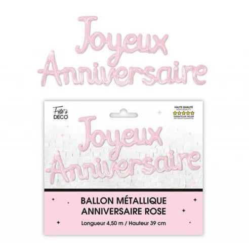 Ballons métalliques couleur qui forment le mot Joyeux Anniversaire. A accrocher en suspension ou fixé sur un mur avec un adhésif double face.