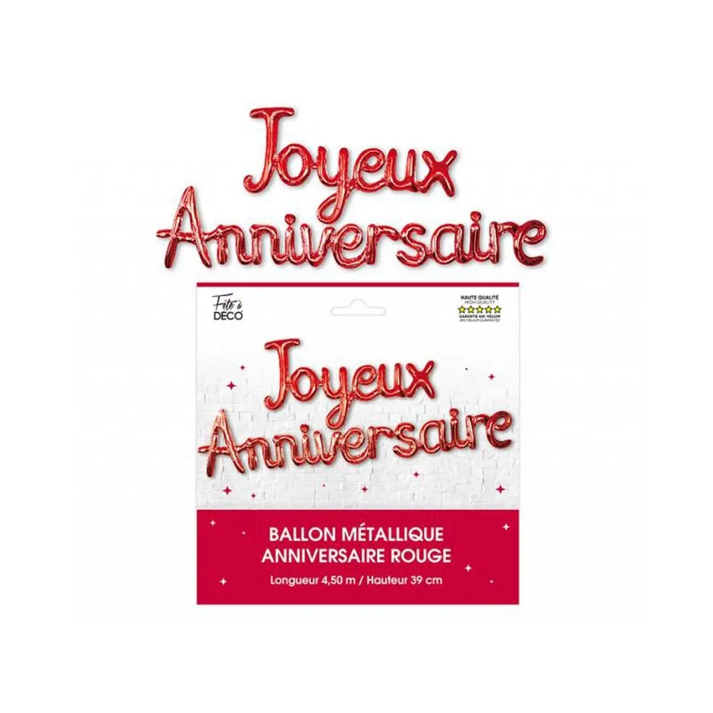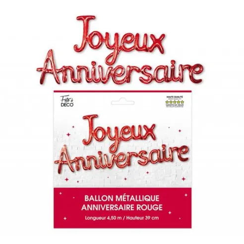Ballons métalliques couleur qui forment le mot Joyeux Anniversaire. A accrocher en suspension ou fixé sur un mur avec un adhésif double face.