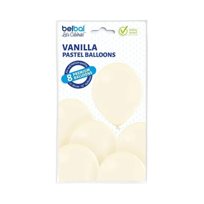 Taille: diamètre 30cm Groupe de couleurs: Pastel Conditionnement: paquet de 8 ballons Gonflage air ou hélium Ballon 100% latex