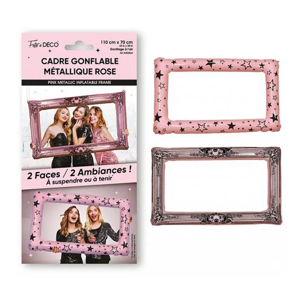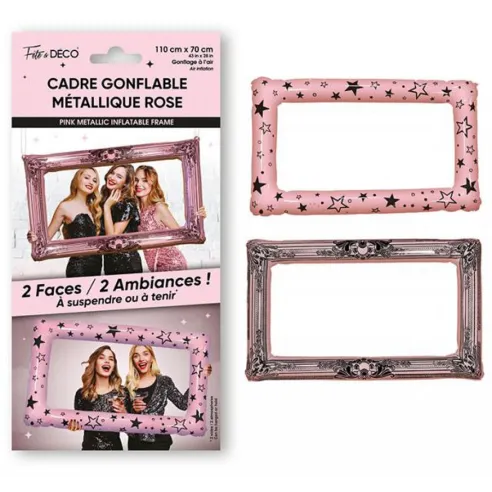 Cadre photo gonflable métallisé couleur avec motifs imprimés sur les deux faces et mesurant 110x70 cm. A gonfler à l'air pour une séance photo colorée et pleine de souvenirs entre amis ou en famille lors de toutes vos soirées.