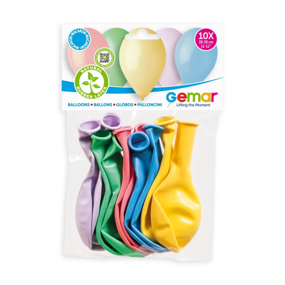 Sachet de 10 ballons en latex aux couleurs macarons pastels, d'un diamètre de 30cm. Pour une décoration douce et harmonieuse grâce à ses couleurs pastels, nos ballons se gonflent facilement à l’air ou à l’hélium pour créer toutes vos fantaisies.