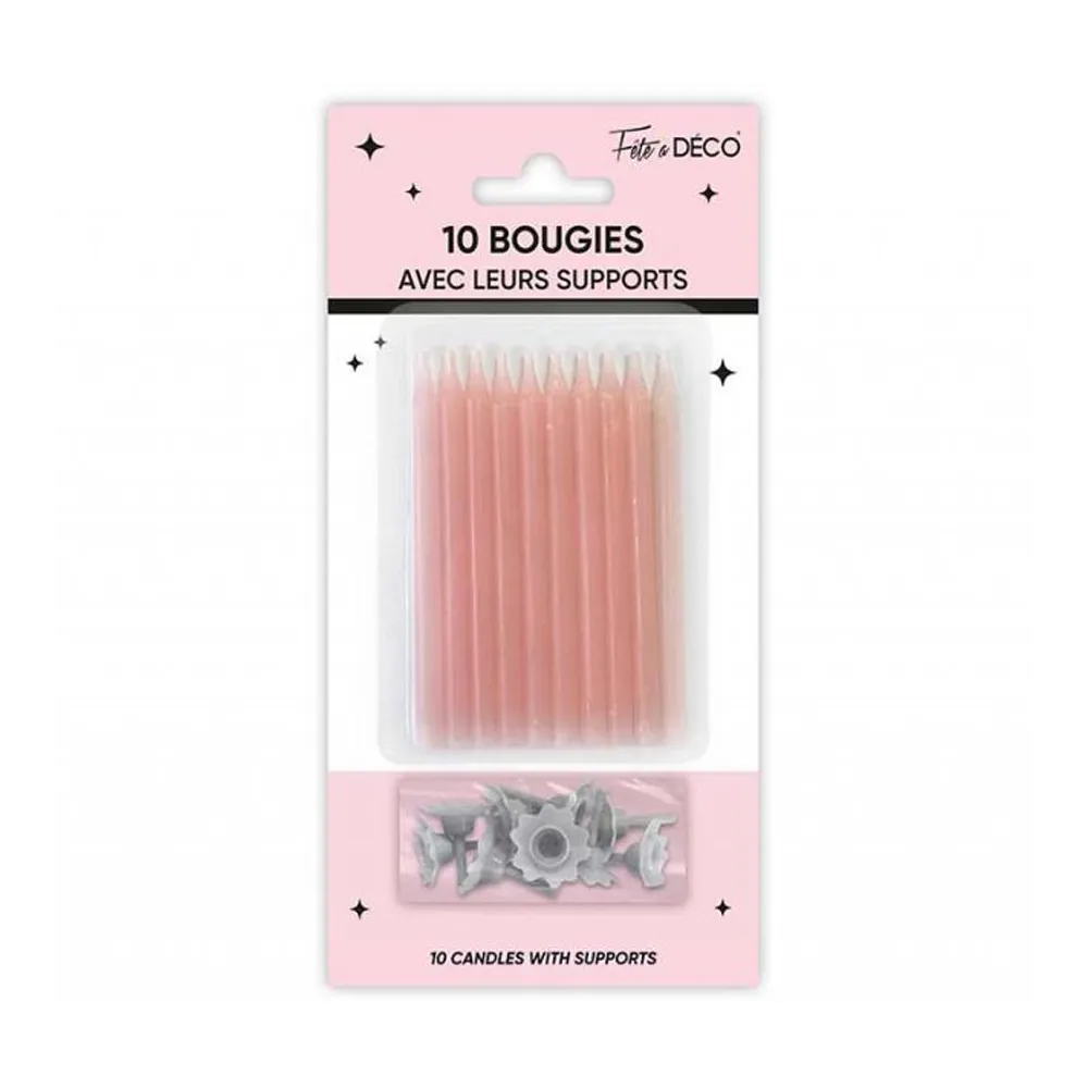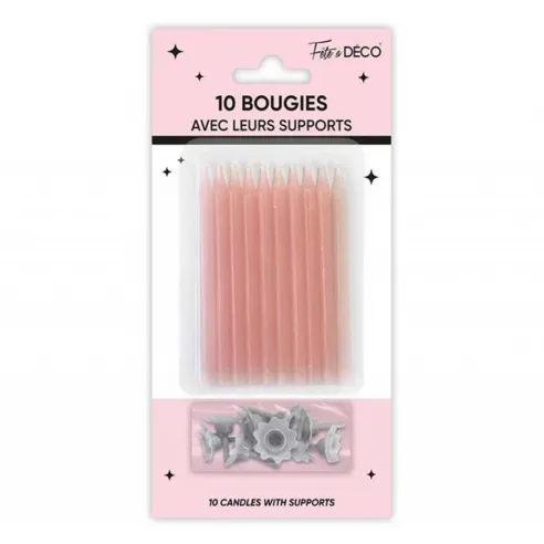 Lot de 10 bougies couleur avec support à mettre sur un gâteau d'anniversaire pour enfants et adultes. Nombreux modèles de bougies tous styles à découvrir chez Festimania.