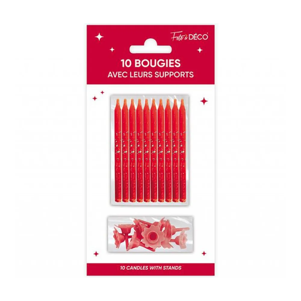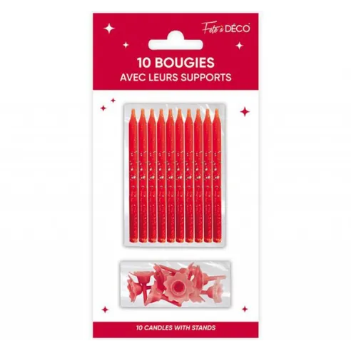 Lot de 10 bougies couleur avec support à mettre sur un gâteau d'anniversaire pour enfants et adultes. Nombreux modèles de bougies tous styles à découvrir chez Festimania.