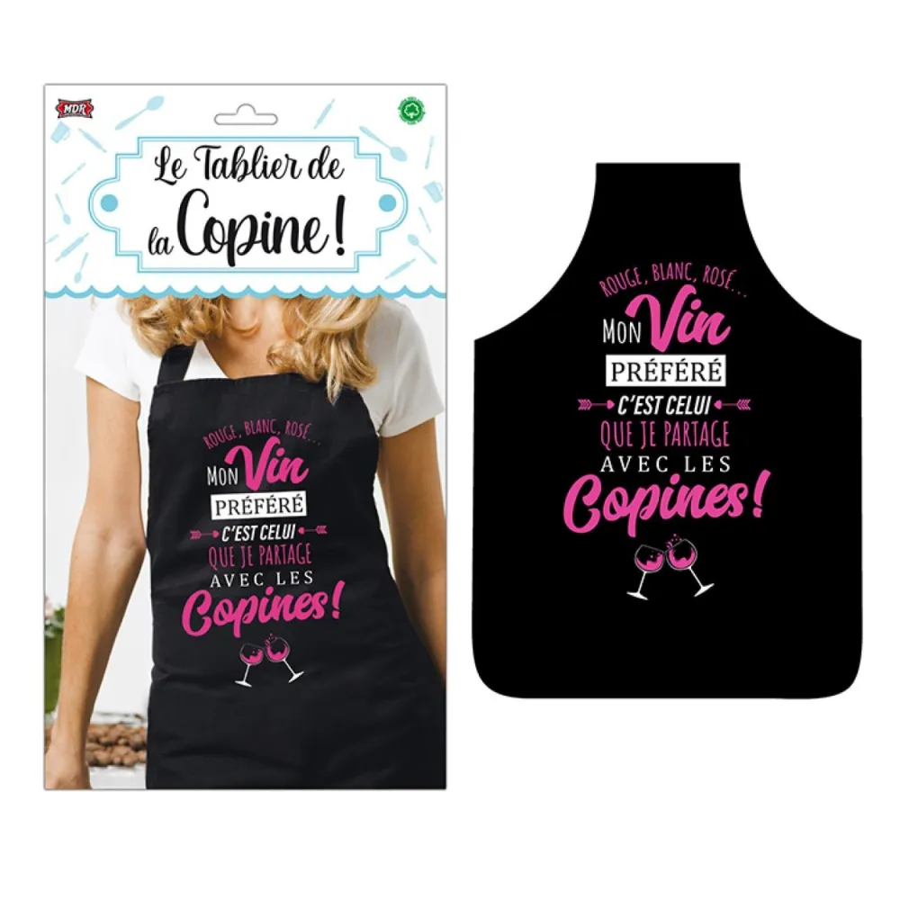 Tablier humoristique noir et rose avec l'inscription: Rouge, blanc, rosé... Mon vin préféré c'est celui que je partage avec les copines !