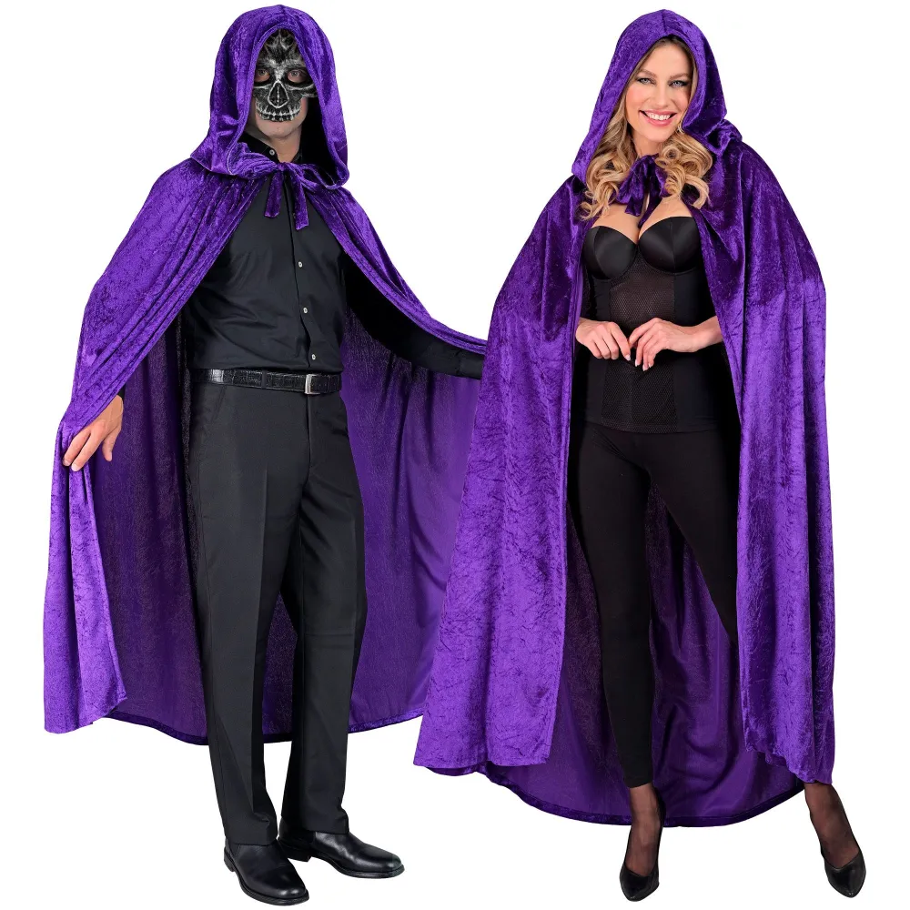 Cape à capuche de couleur violet et d'une longueur de 140cm à nouer autour du cou pour un maintien parfait. Cape mixte pour homme et femme pouvant convenir à de nombreux thèmes de déguisements.