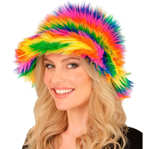 Chapeau de pêcheur de couleur arc-en-ciel fluorescent, une coiffe pour adulte flashy à enfiler sur la tête pour rejoindre sa bande favorite et aller défiler au carnaval.