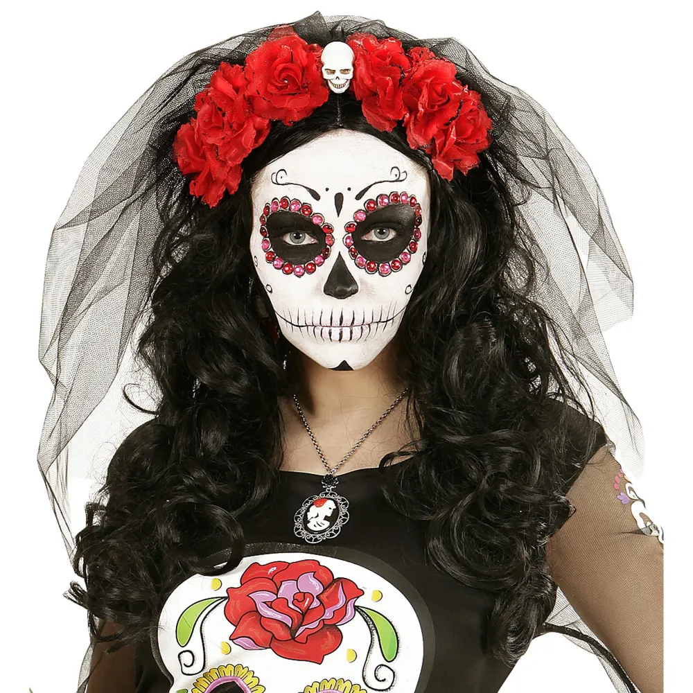 Coiffe roses rouges avec voile noir et tête de mort