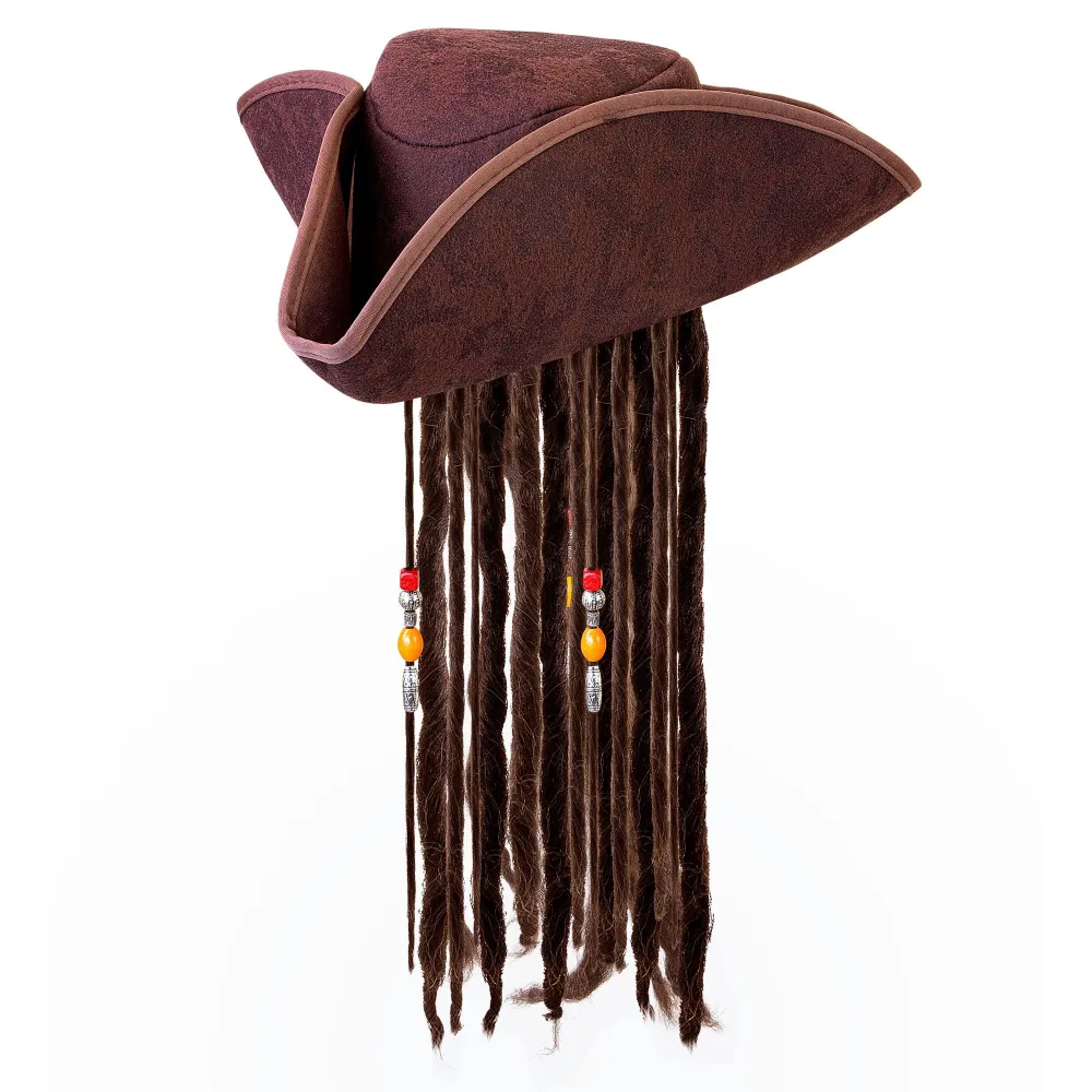 Chapeau tricorne pirate marron avec un effet simili cuir avec cheveux dreadlocks. Coiffe adulte pour déguisement de flibustier et naviguer sur les océans autour du monde.