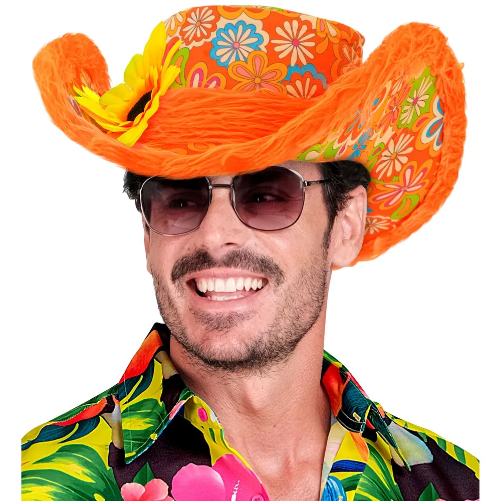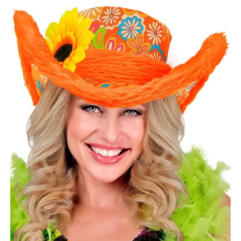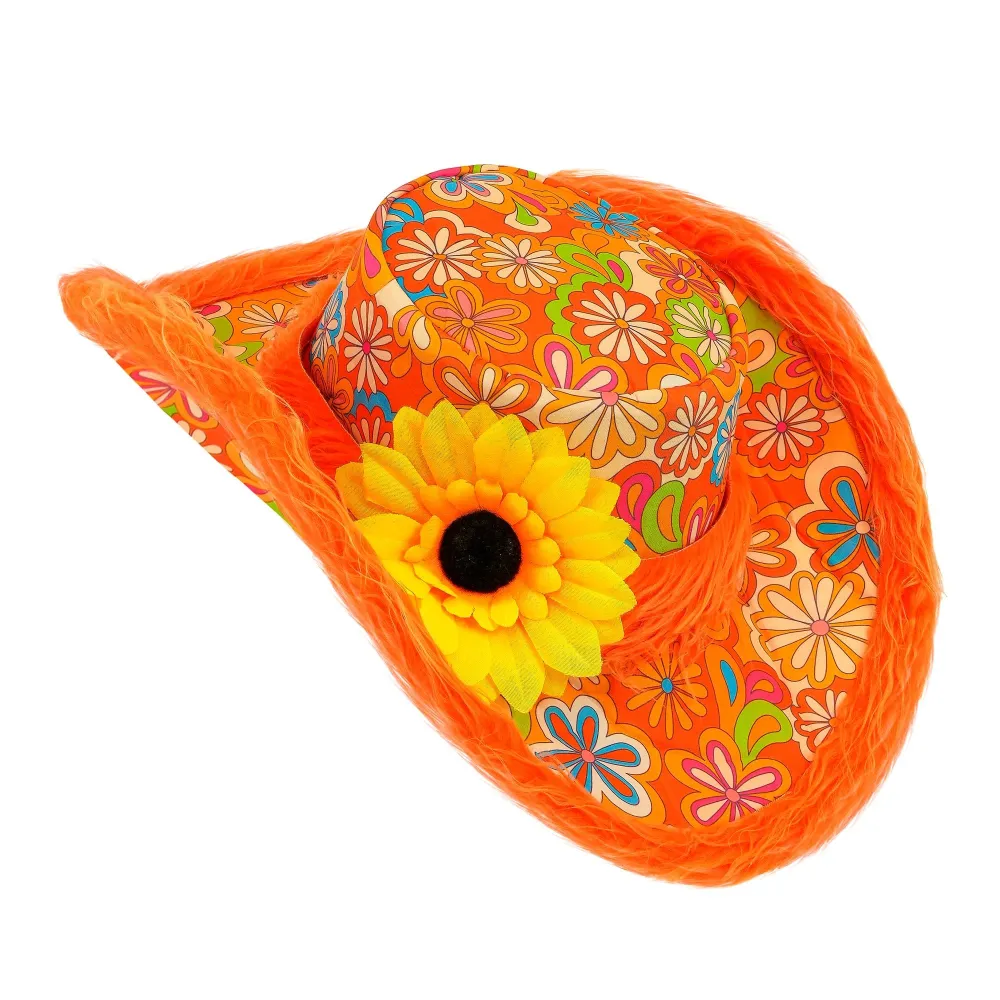 Chapeau Ibiza coloré avec bordure peluche, imprimé de motifs fleuris et orné d'un tournesol. Magnifique chapeau sur le thème hippie et années 70 ou pour compléter un déguisement de carnaval.