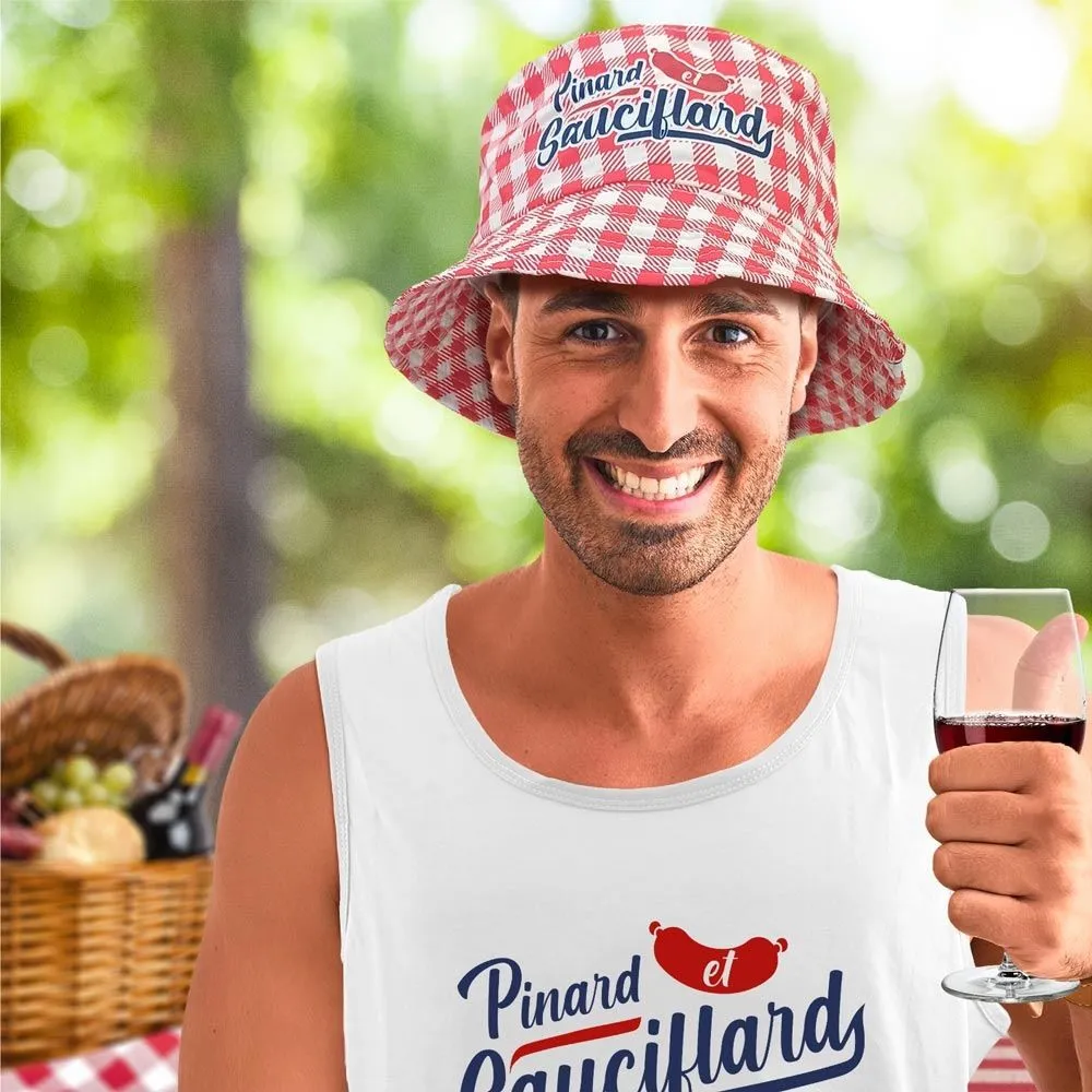 Bob au motifs vichy de couleur rouge et blanc avec le texte "Pinard et Sauciflard". Un chapeau humoristique à porter sous le soleil cet été au moment de l'apéritif entre amis.