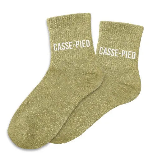 Vous cassez les pieds à tout le monde et en êtes fier ? Alors cette paire de chaussette humoristique est faite pour vous, de couleur doré pailleté avec le texte "Casse-Pied" écrit en blanc, elles sublimeront votre tenue en toutes circonstances.