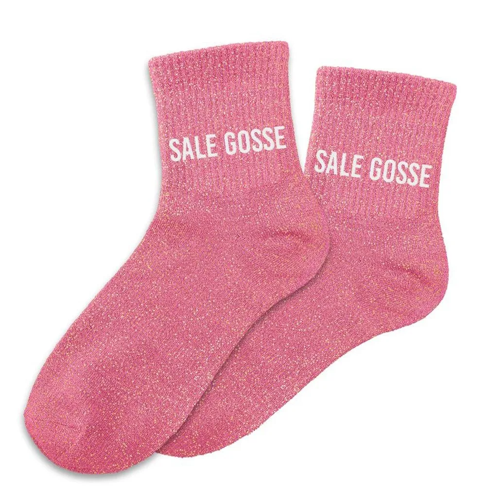 Enfilez cette paire de chaussettes roses à paillettes avec la mention "Sale Gosse" écrit en blanc. Des chaussettes pailletées humoristiques à offrir aux copines pas toujours très sages.