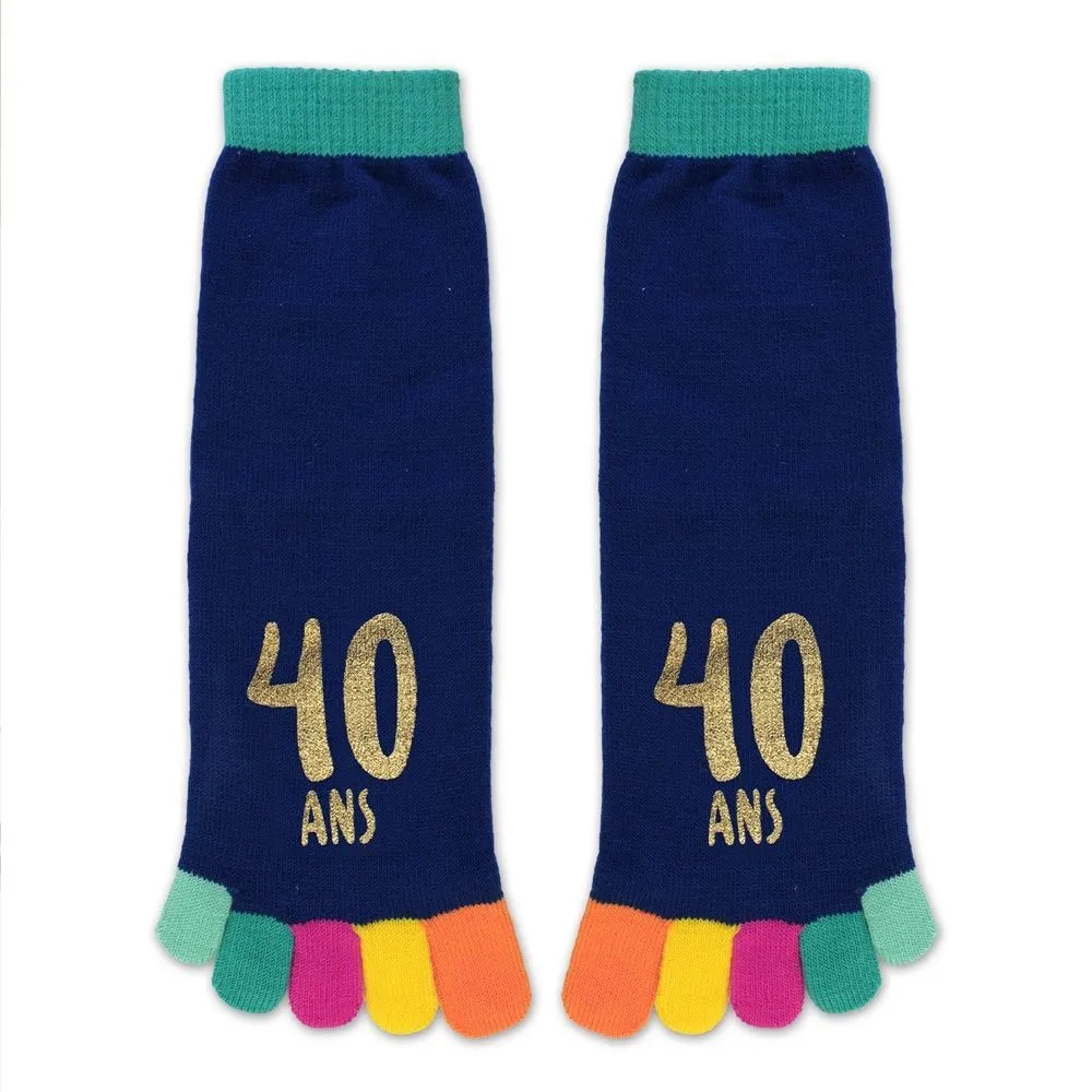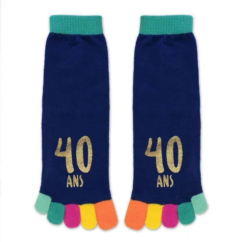 Paire de chaussettes anniversaire 40 ans, de couleur bleu avec orteils multicolores et 40 ans écrit en lettres dorées. Faites votre choix parmi une large gamme de chaussettes originales à offrir pour toutes occasions.