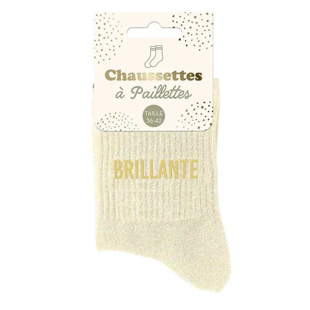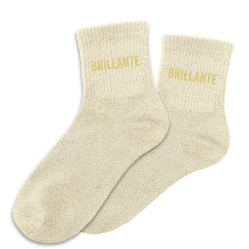 Enfilez cette paire de chaussettes beige à paillettes avec la mention "Brillante" écrit en lettres dorées. Des chaussettes pailletées originales à offrir ou s'offrir en cadeau.