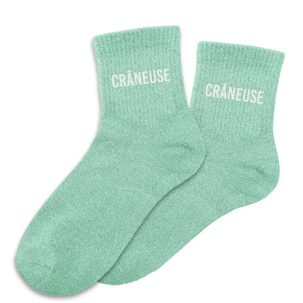 Paire de chaussettes à paillettes couleur turquoise avec l'inscription "Crâneuse" inscrit en blanc. Chaussettes à offrir en cadeau à une copine qui se la pète un peu de trop.