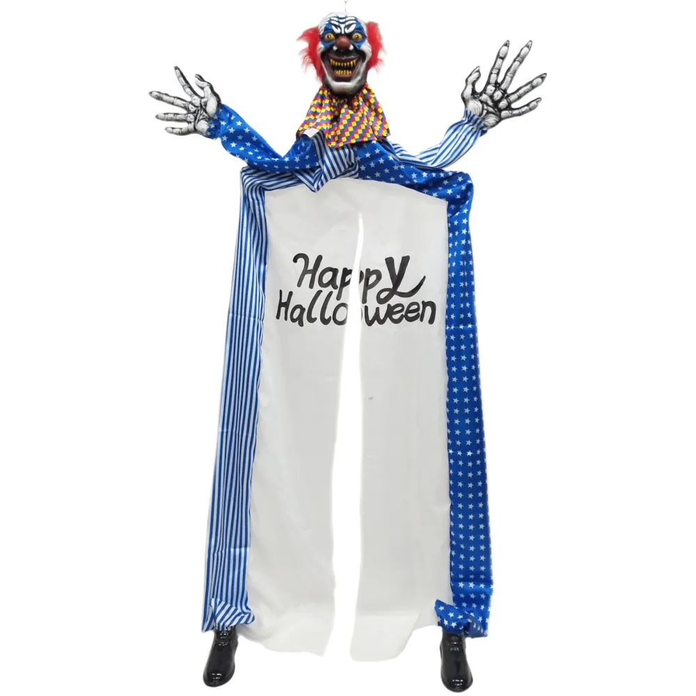 Immense décoration animée, lumineuse et sonore de clown géant à placer à une entrée de porte pour votre soirée avec la mention Happy Halloween. Frissons garantis lors de l'arrivé de vos invités.