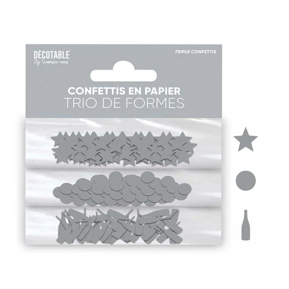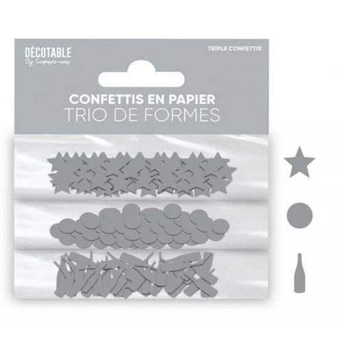 Egayez votre table de fête avec ce trio de confettis couleur, sachet contenant 3 formes de confettis: étoiles, ronds et bouteilles. A parsemer sur une table d'anniversaire ou un repas de fêtes de fin d'année.