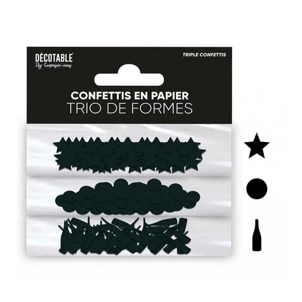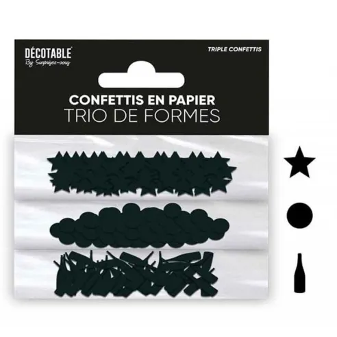 Egayez votre table de fête avec ce trio de confettis couleur, sachet contenant 3 formes de confettis: étoiles, ronds et bouteilles. A parsemer sur une table d'anniversaire ou un repas de fêtes de fin d'année.