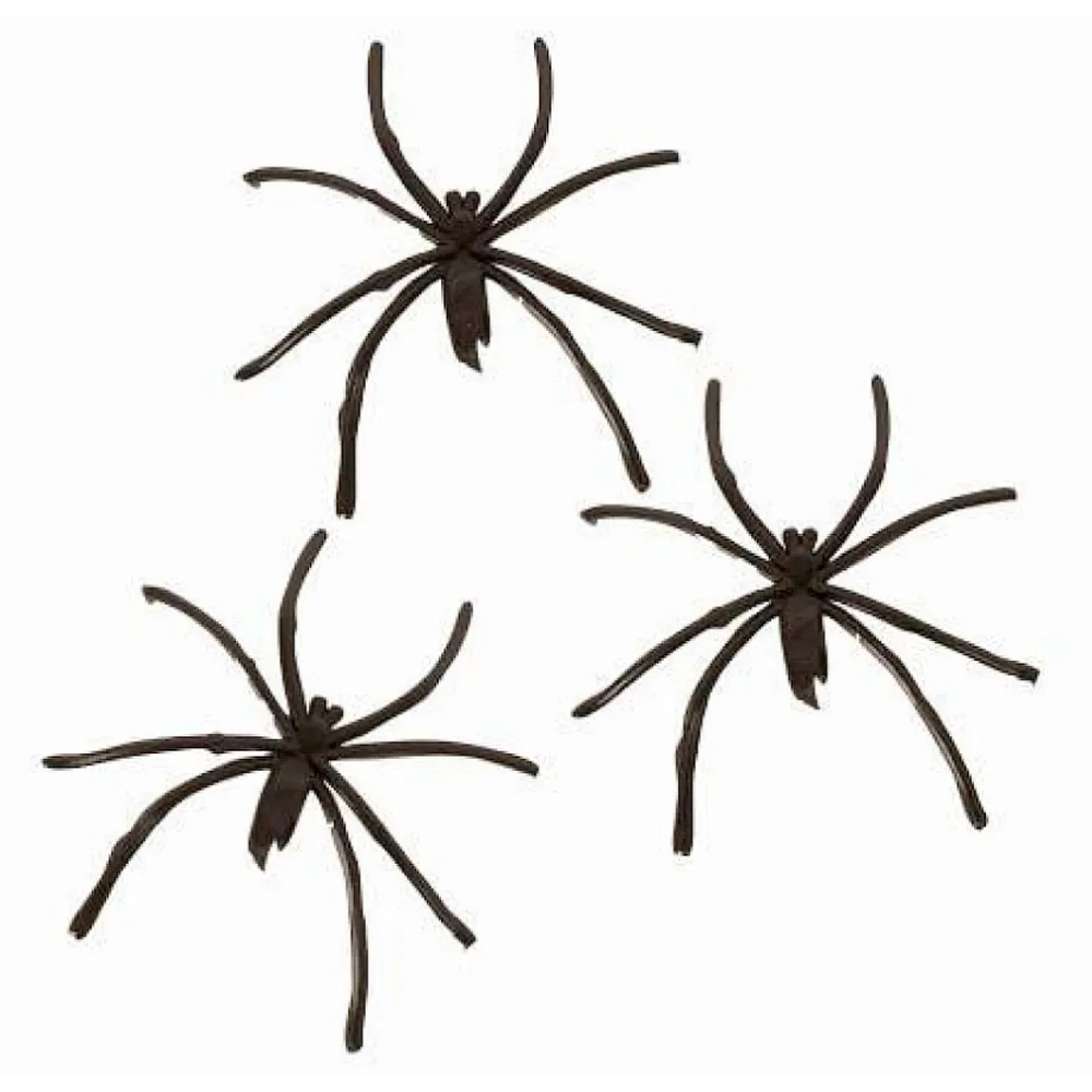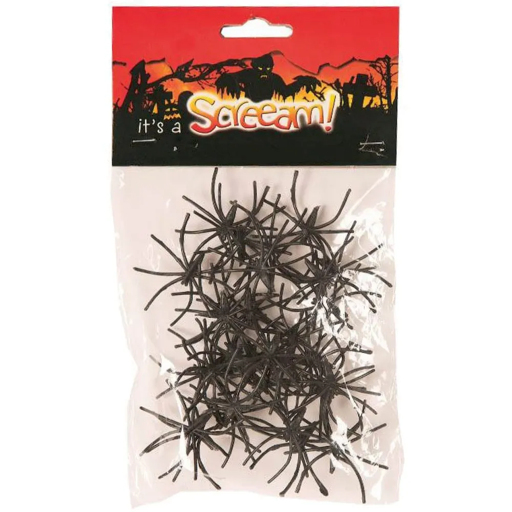 Lot d'une trentaine de petites araignées noires à clairsemer pour une décoration de table à Halloween ou à disséminer sur une toile tissée.