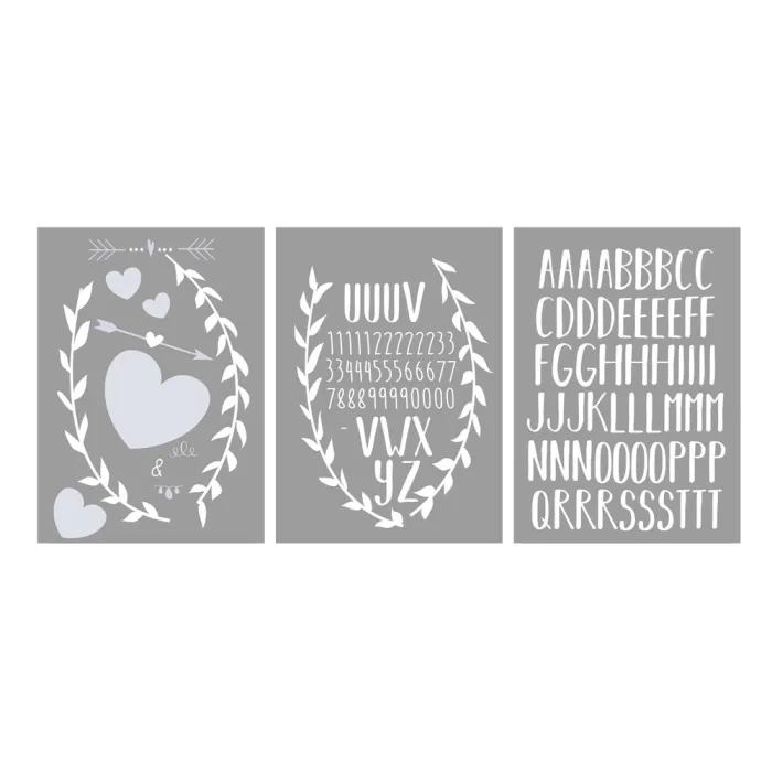 Comprenant une couronne de branches d’olivier, 3 petits cœurs, un grand cœur ainsi que la flèche de Cupidon transperçant un cœur, vous trouverez également l’ensemble des lettres de l’alphabet qui vous permettront d’écrire les prénoms des mariés.