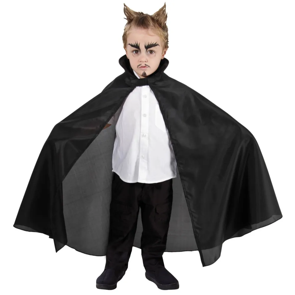 Indispensable pour compléter un costume de vampire, la cape taffetas mesure 85 centimètres de longueur. Idéale pour donner du volume à la tenue, elle est agrémentée d’un col haut.
