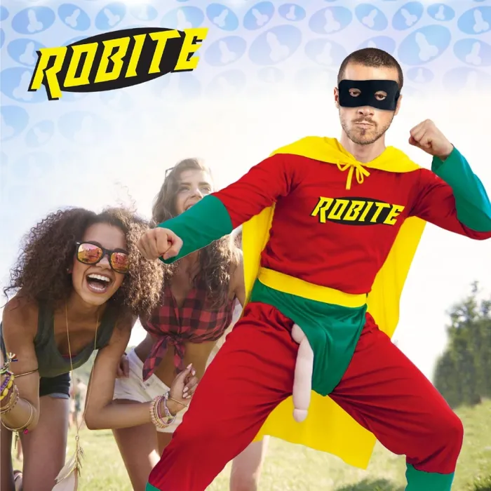 Grâce à l'esthétique unique de ce déguisement reprenant le costume du célèbre partenaire de la chauve souris avec humour, vous pourrez vous présenter en tenue de Ro"Bite" le temps d'une soirée.