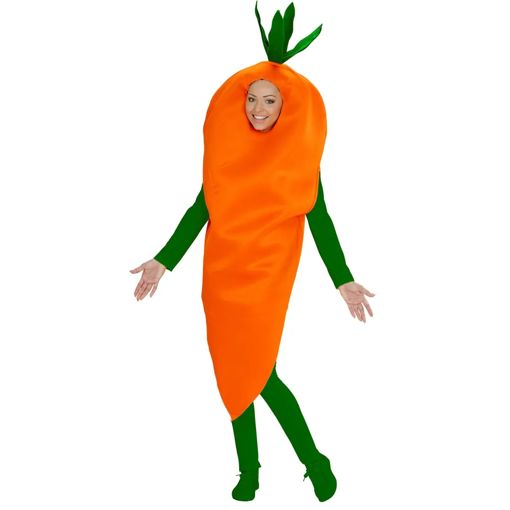 Déguisement de carotte orange pour adulte avec la combinaison orange et verte. C'est le costume parfait homme et femme, pour un carnaval ou une soirée sur le thème de la ferme ou la nature.