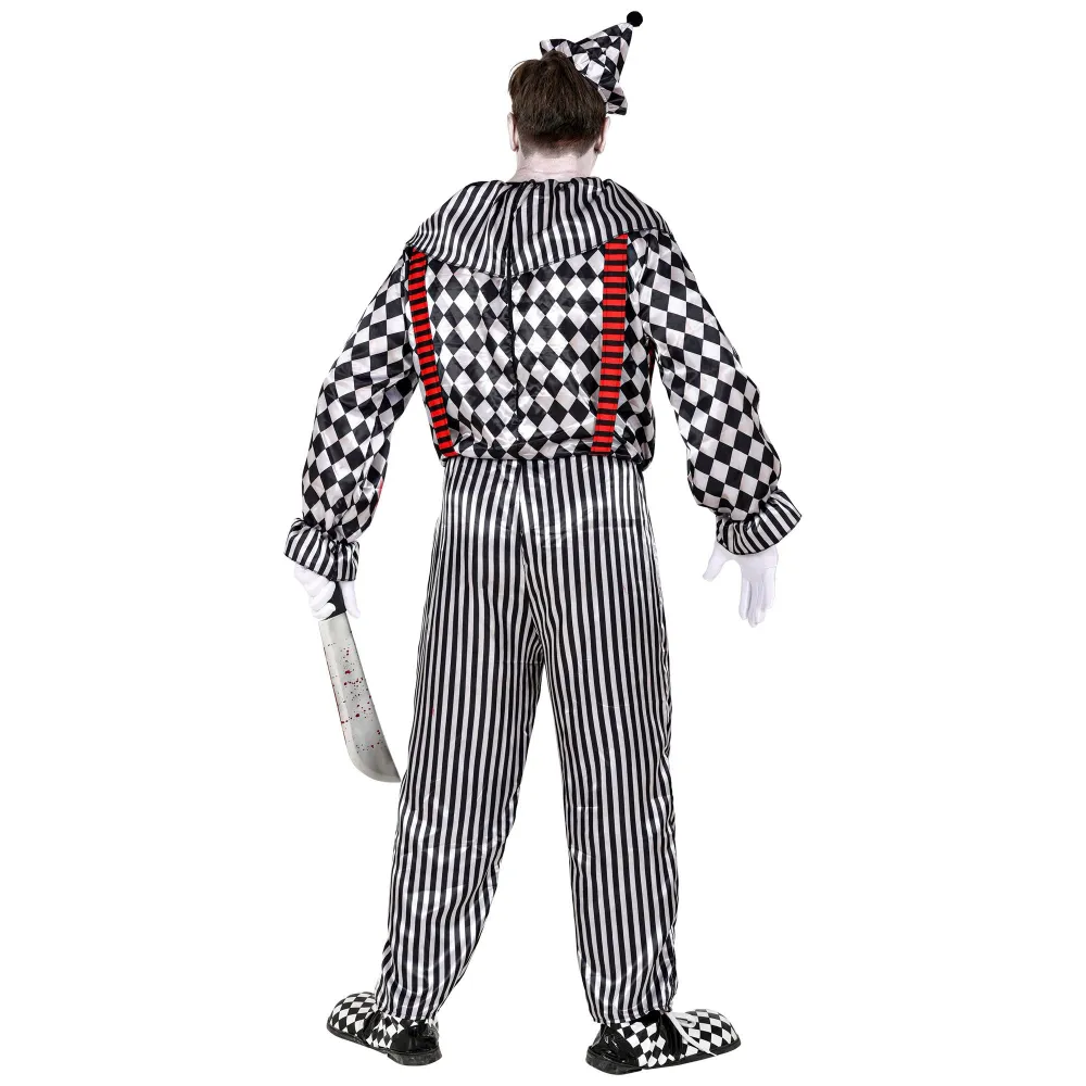 Déguisement de clown vintage avec une combinaison noire et blanche, à carreaux et à rayures tachée de sang, pour costume de cirque sanglant Halloween ou film d'horreur.