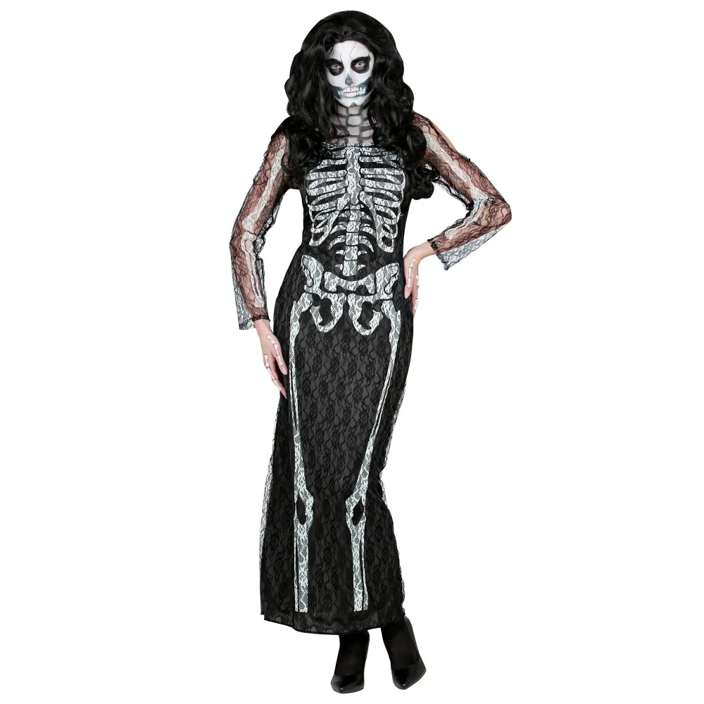 Déguisement de squelette pour femme, avec longue robe dentelle noire et blanche, imprimée sur le devant avec ossements. Tous les déguisements pour Halloween sont dans votre magasin Festimania.