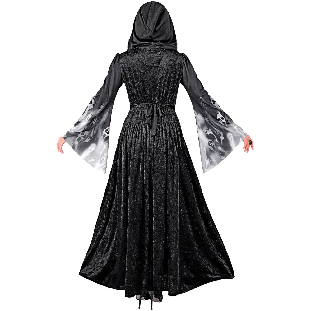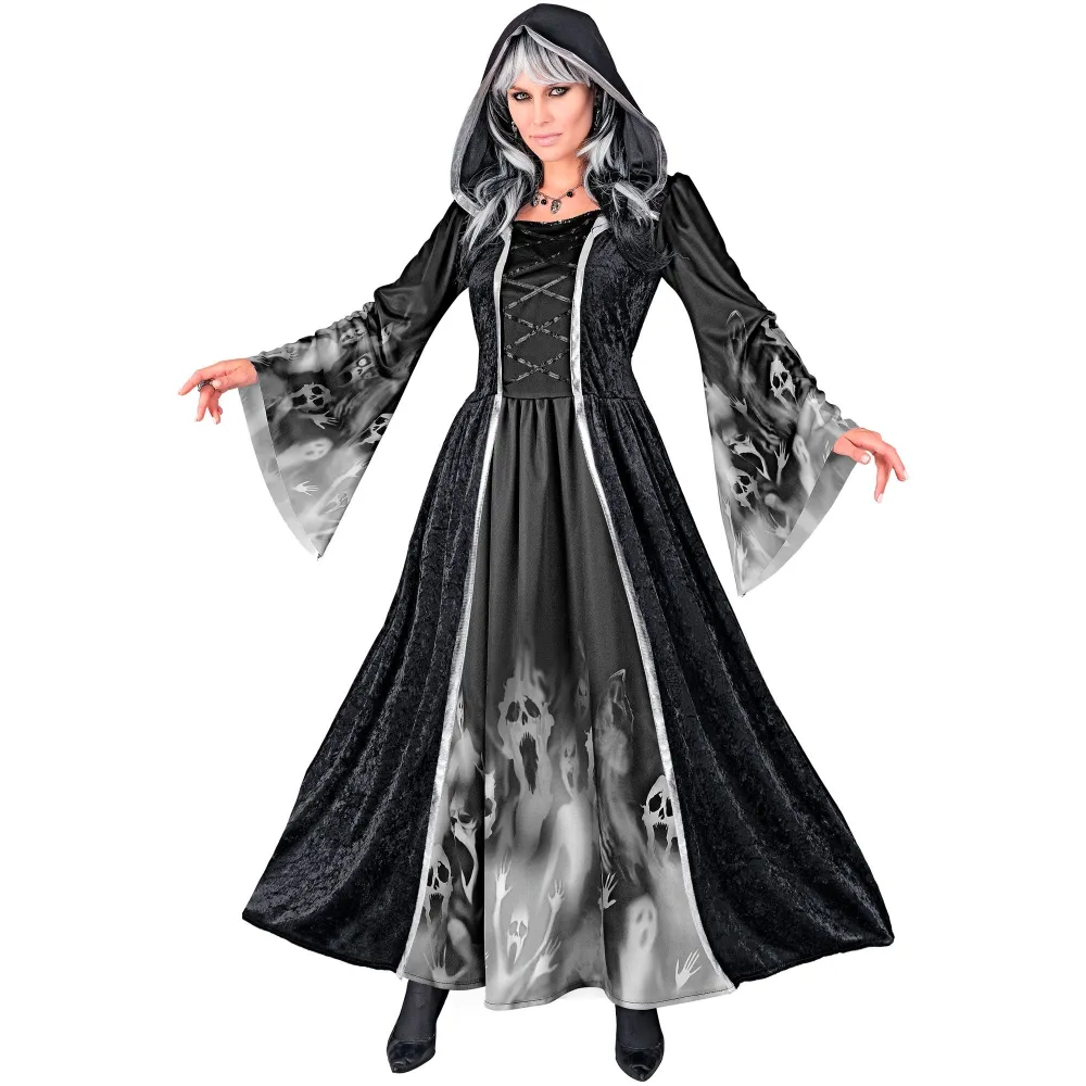 Déguisement Halloween pour femme composé d'une longue robe à capuche avec des dégradés de couleur noire, ainsi que des impressions d'âmes hurlantes sur les manches et le bas de la robe.