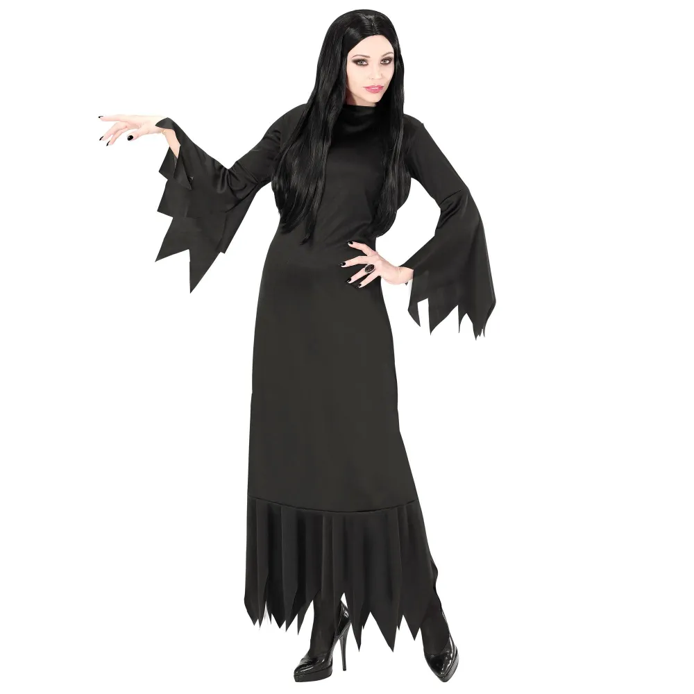 Longue robe noire avec manches évasées, évoquant le style de Morticia dans la Famille Addams, déguisement Halloween pour femme en vente chez Festimania.