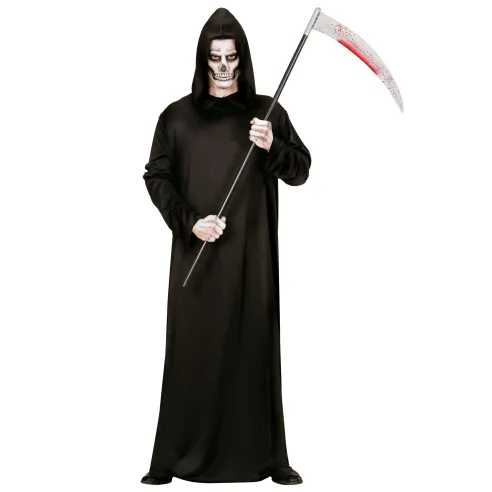 Déguisement de faucheur de la mort pour adulte comprenant la longue tunique noire avec capuche. Il ne reste plus qu'à vous emparer de votre arme favorite pour aller promener le soir d'Halloween.