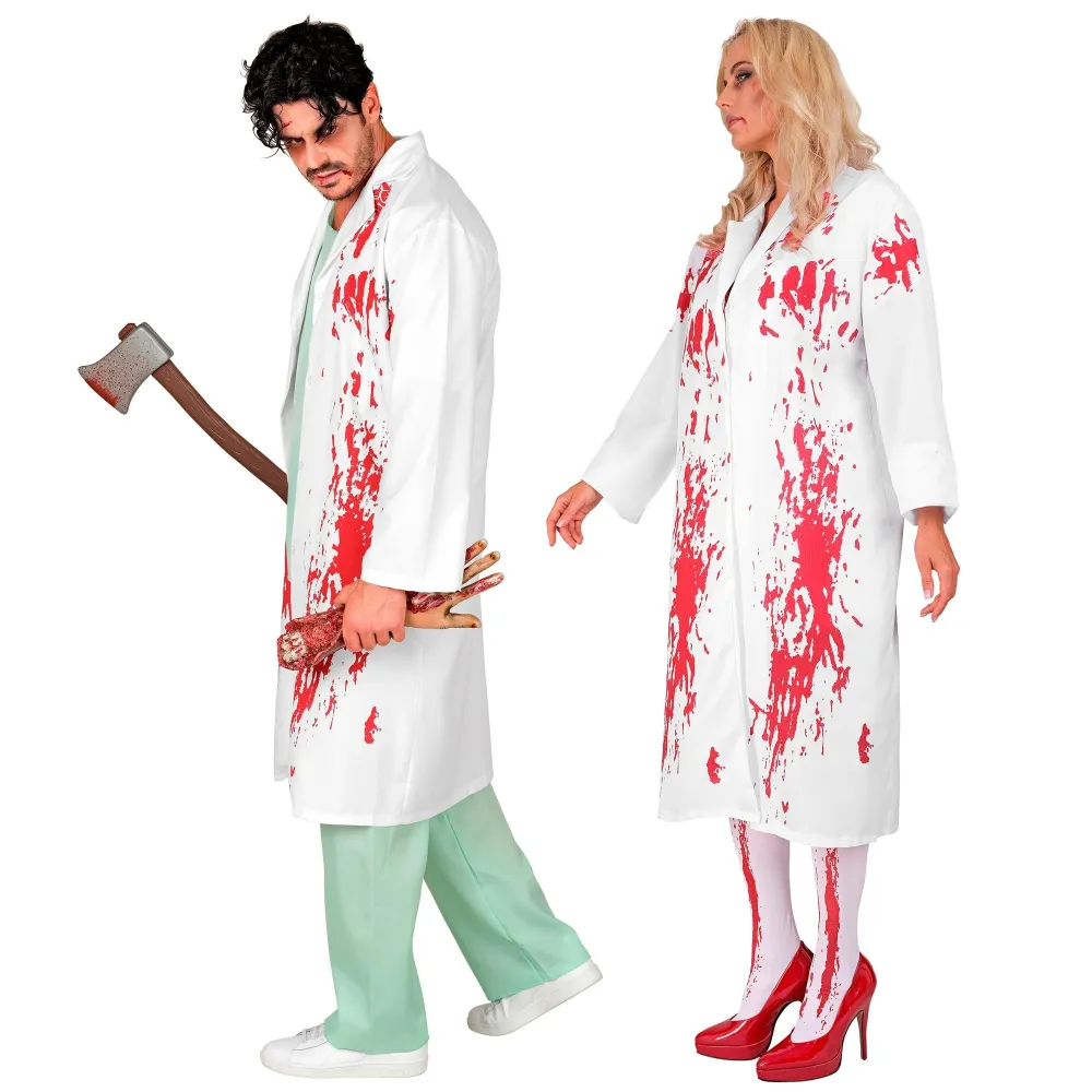 Déguisement de médecin ensanglanté pour homme et femme, comprenant une blouse blanche couverte de taches de sang pour soirée thème Halloween.