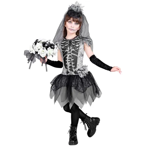 Déguisement de squelette mariée pour enfant, dans les tons noirs et gris avec motifs d'os imprimés. Costume comprenant la robe, les mitaines et la coiffe de mariée pour Halloween.
