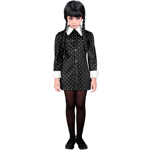 Déguisement pour fille rappelant le style de Mercredi Addams avec sa robe noire à pois blancs. Costume pour carnaval d'école ou pour soirée Halloween.