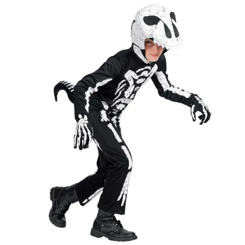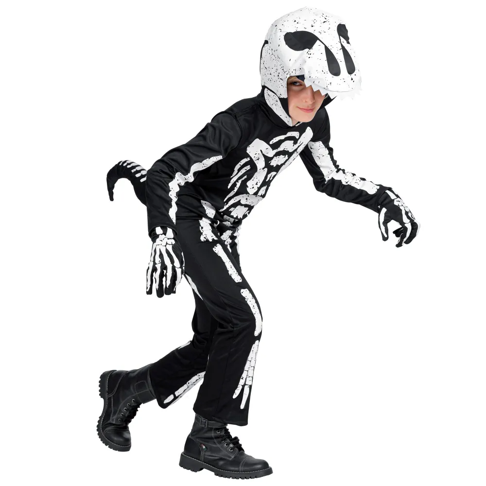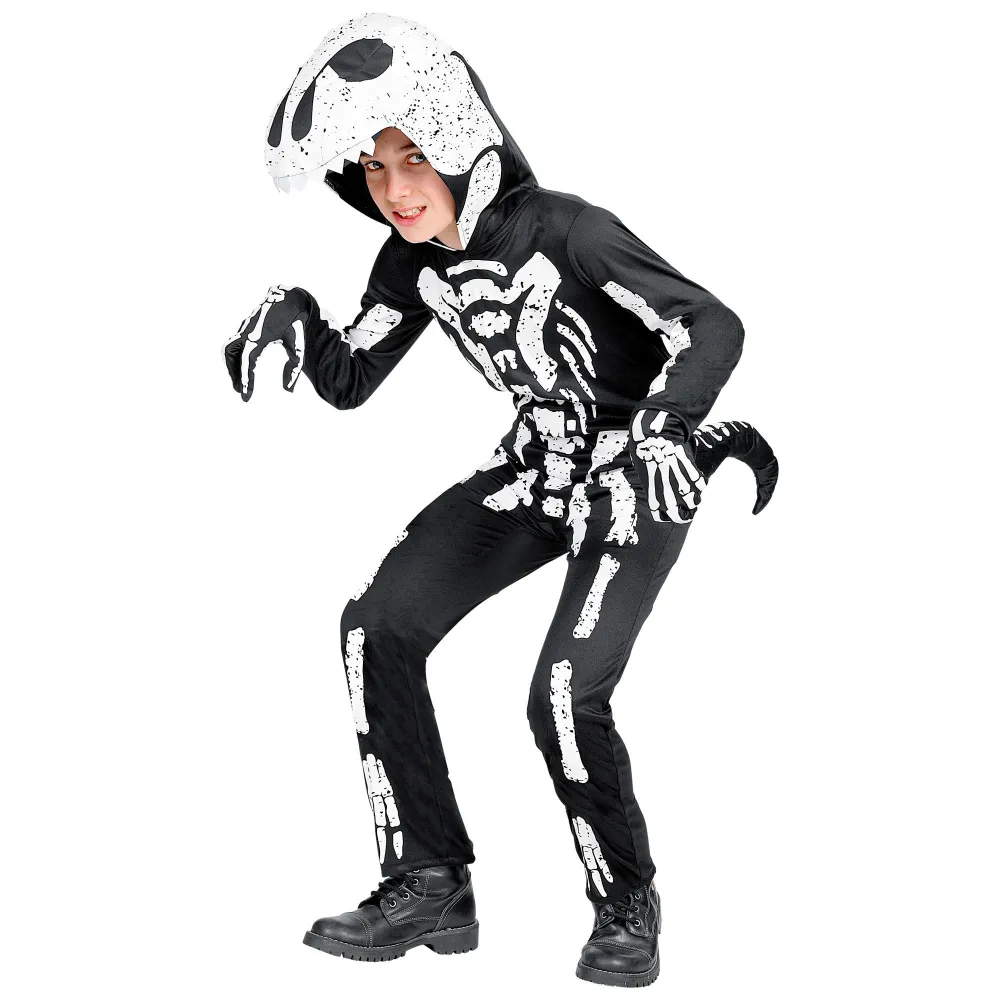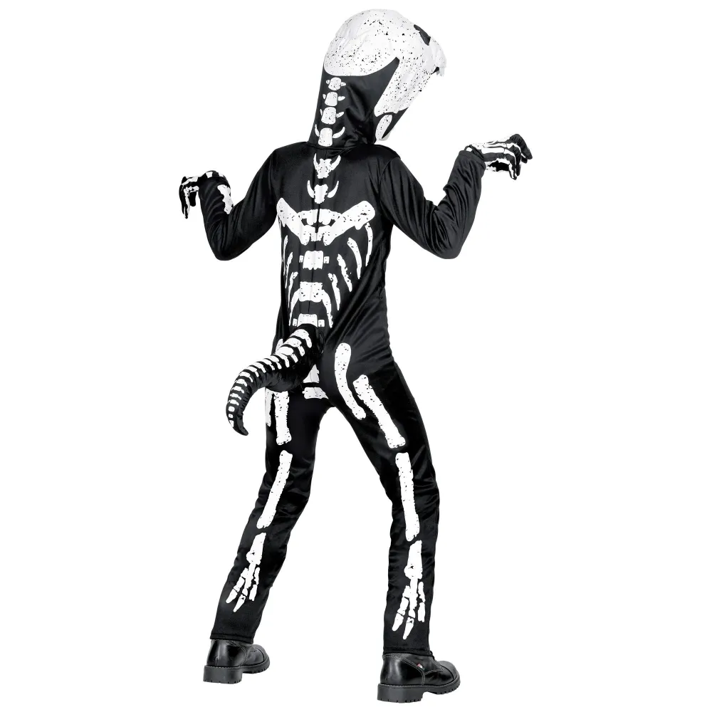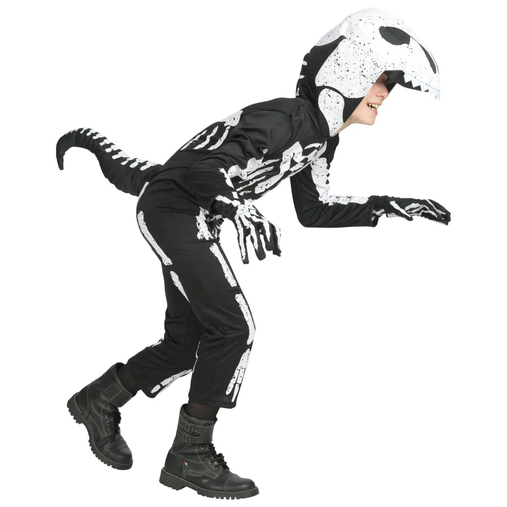 Déguisement de dinosaure t-rex squelette pour enfant, composé d'une combinaison imprimée noire et blanche avec la capuche et le masque assorti.