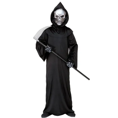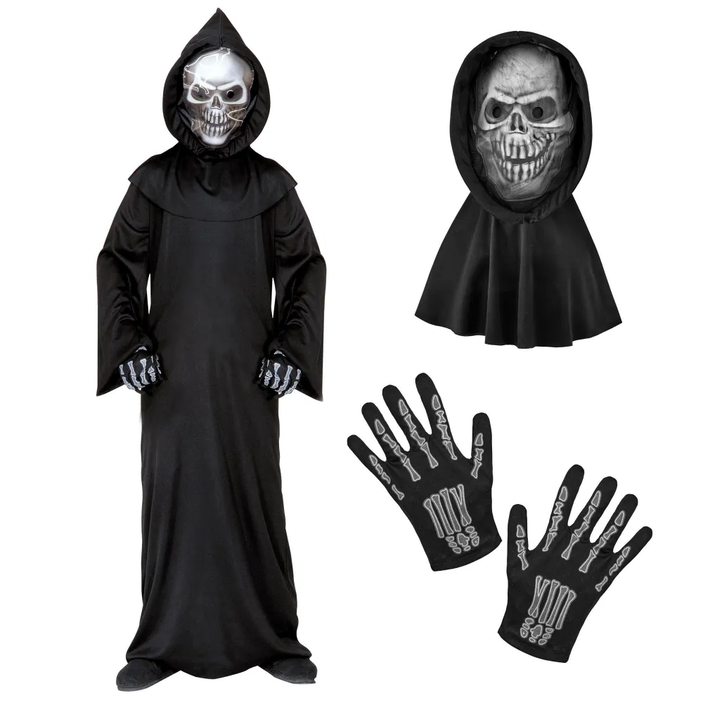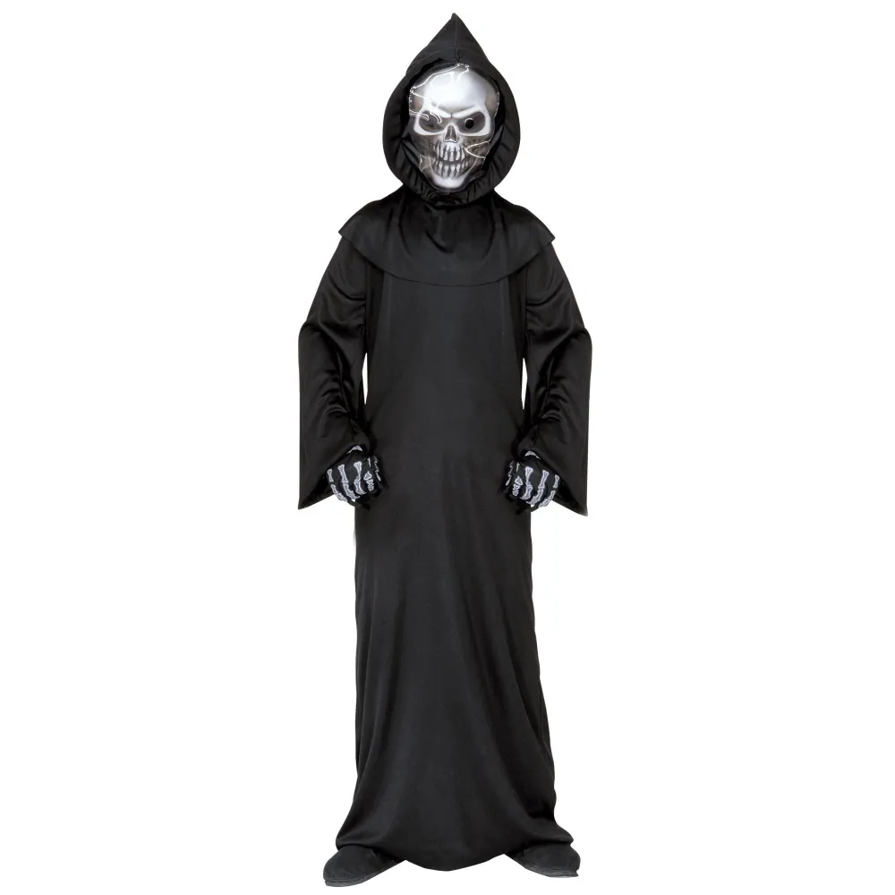 Déguisement de faucheuse de la mort pour enfant comprenant la longue tunique noire, le masque crâne holographique avec capuche et les gants avec os imprimés. Le costume parfait pour effrayer les passants le soir d'Halloween.
