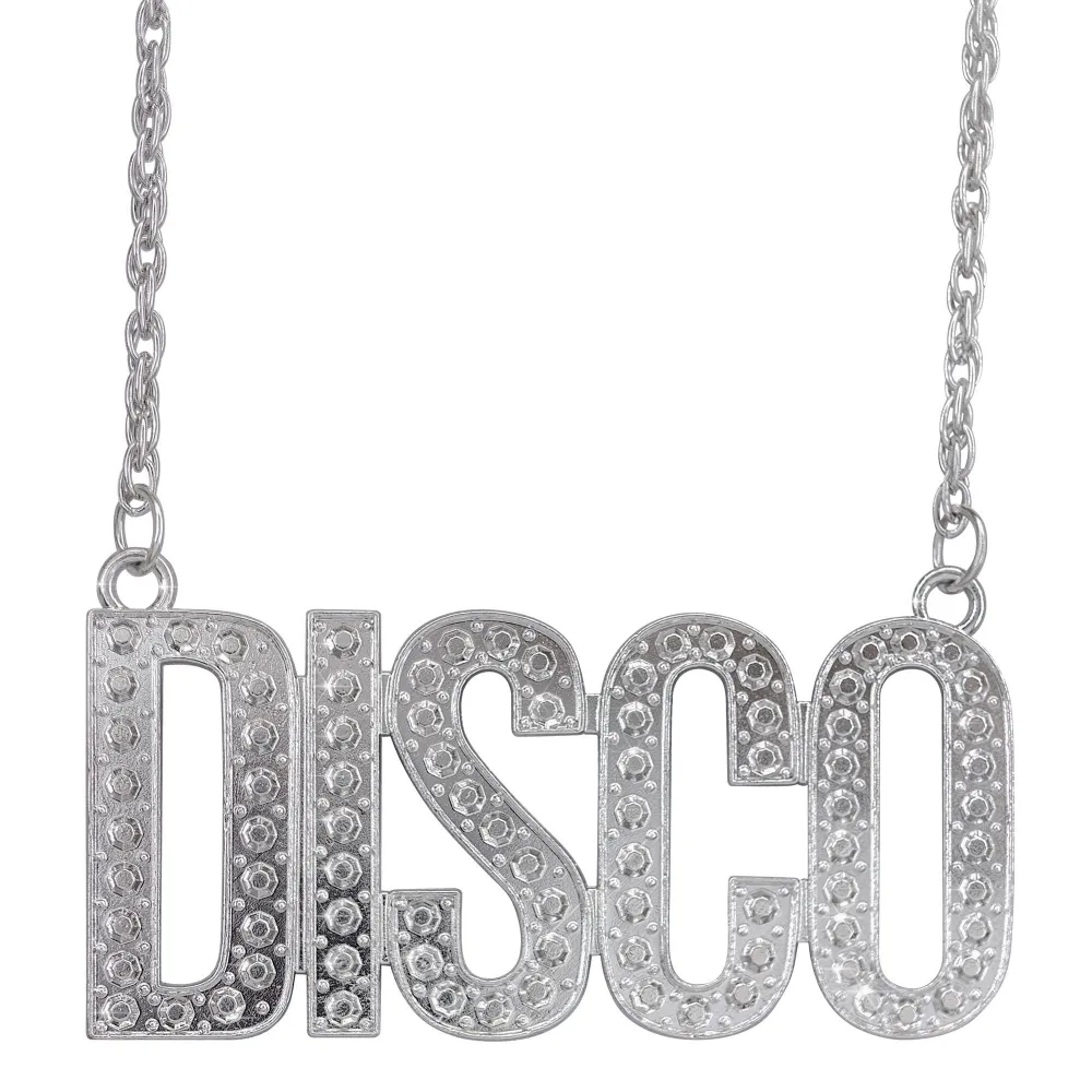 Enfilez ce collier avec les lettres DISCO brillantes argentées autour de votre cou. Un bijoux de fête parfait pour compléter votre costume pattes d'éléphants sur le thème des années 70 et 80.