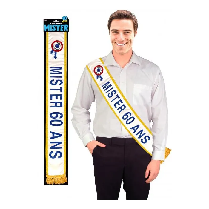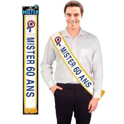 Un proche entame une nouvelle décennie ? Faite de lui le roi de la soirée en lui offrant cette superbe écharpe "Mister 60 ans". Satinée aux bordures dorées, écriture bleu pailletée, franges dorées et cocarde tricolore, cette écharpe s'apparente aux écharpes officielles . Une fois placée sur l'épaule et en diagonale sur le torse, elle fera à coup sûr son effet